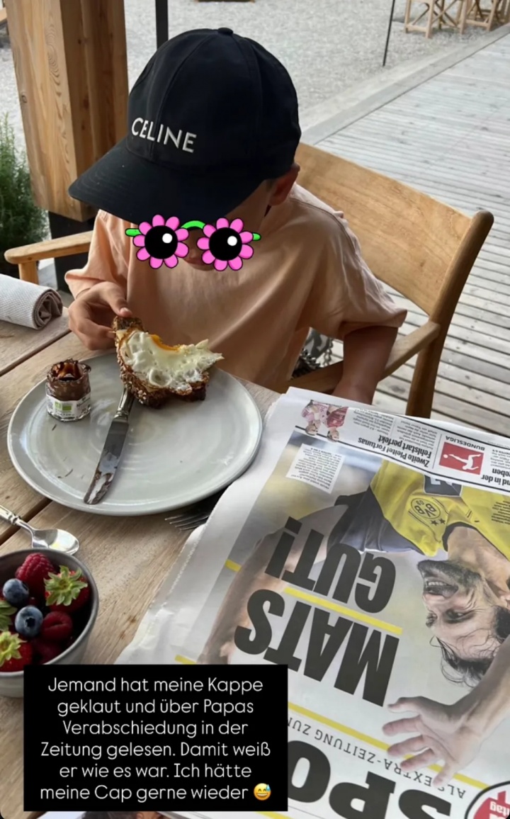 凯茜随后在社交平台发声澄清,次日她发布了一张儿子享用甜点的照片,餐桌上摆放着报道胡梅尔斯比赛的报纸头版。